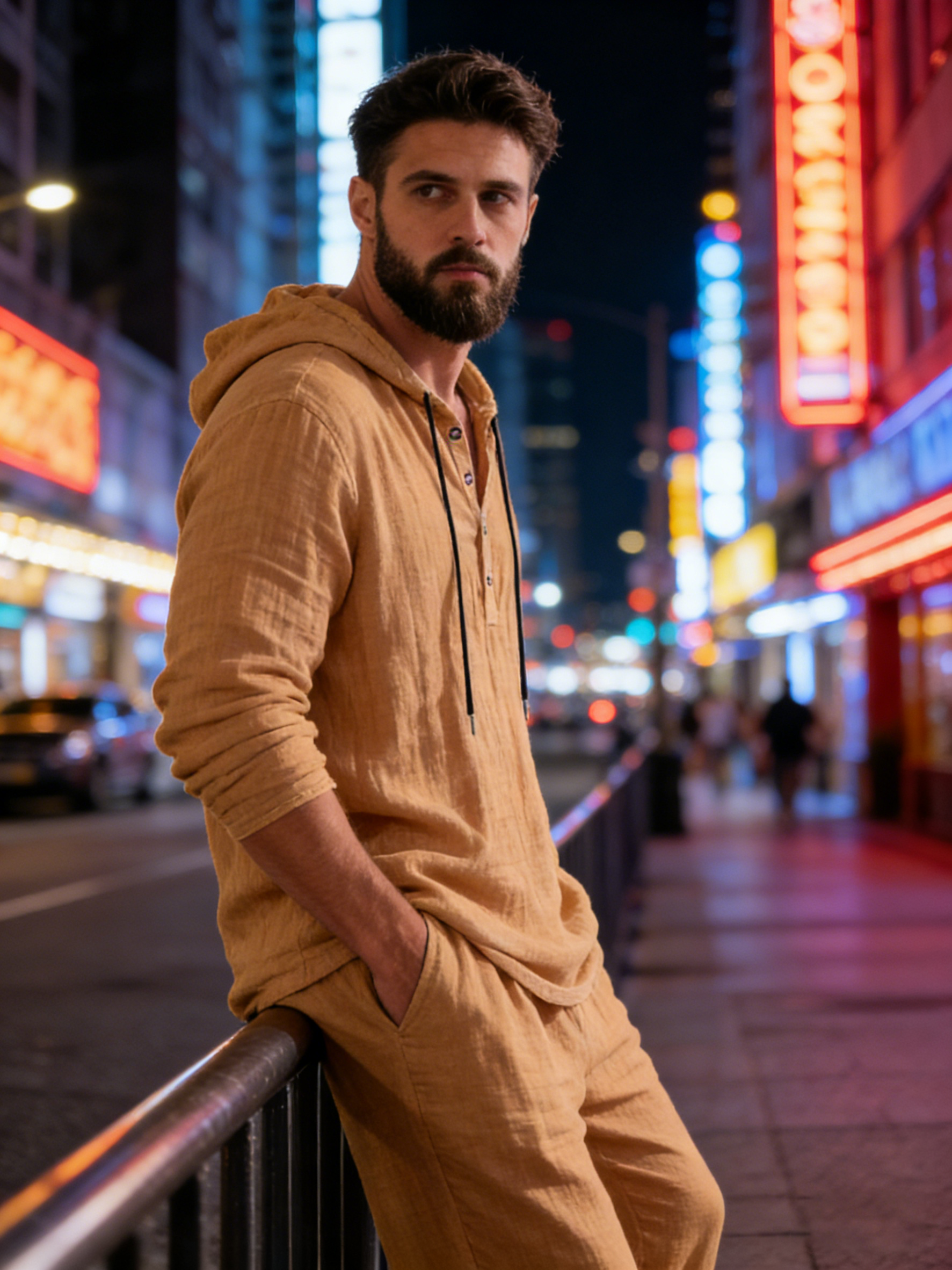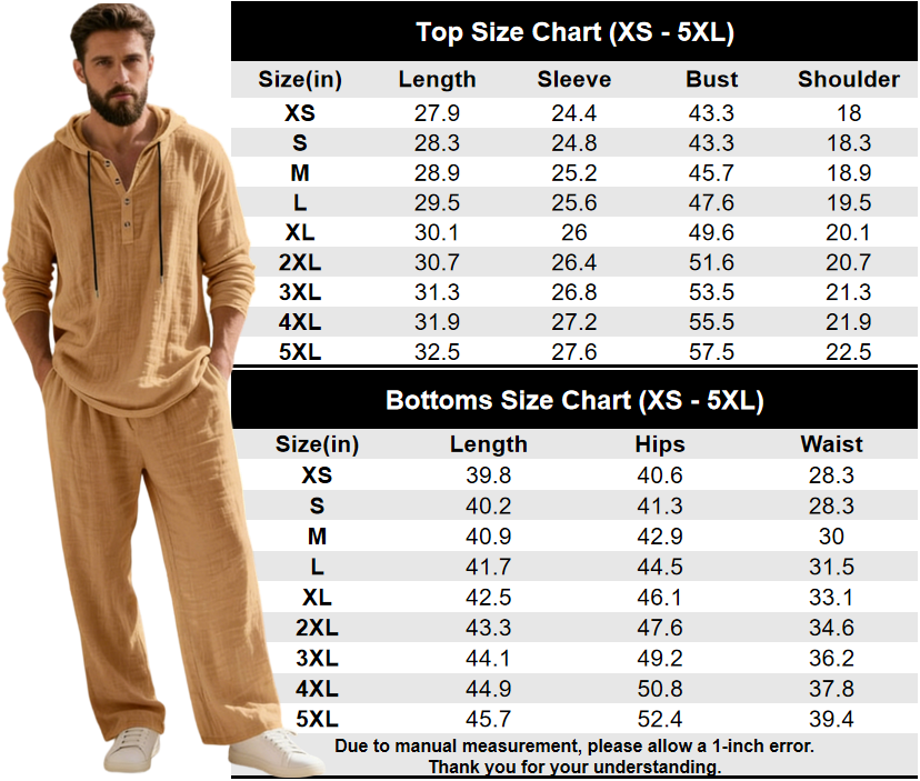 Men's Trendy Linen Hooded Two-Piece Set, Casual Vacation Style, Loose Fit Breathable Fabric, Hoodie & Wide-Leg Pants, Spring & Fall WearMen's hooded shirt with button closure, long sleeves, two pockets, simple style, solid colour, rounded hem. Loose Fit: Features a loose-fitting silhouette that enhances freedom of movement for leisure and casual activities.These 2 piece outfits can be matched with sneakers, sandals for a chic and trendy look.