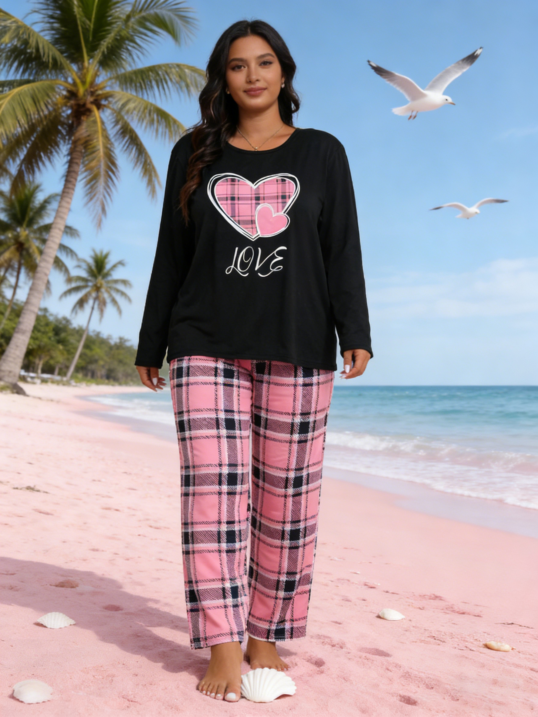 Plaid Pattern: Featuring a classic plaid pattern, this set offers a timeless look that's both attractive and memorable.Bow Accent: Decorated with a charming bow accent, it adds a playful touch to your evening relaxation wear.【Plus Size】 Two-piece Set Long Sleeve Heart Print Tee & Plaid Print Bow Decor Pants Pyjama, Casual Comfy Round Neck Top & Trousers Pj Set, Women's Sleepwear for Spring & Fall Pajamas【Plus Size】 Two-piece Set Long Sleeve Heart Print Tee & Plaid Print Bow Decor Pants Pyjama, Casual Comfy Round Neck Top & Trousers Pj Set, Women's Sleepwear for Spring & Fall PajamasLong Sleeves: Designed with long sleeves, it provides added warmth during the autumn and winter seasons.【Plus Size】 Two-piece Set Long Sleeve Heart Print Tee & Plaid Print Bow Decor Pants Pyjama, Casual Comfy Round Neck Top & Trousers Pj Set, Women's Sleepwear for Spring & Fall Pajamas【Plus Size】 Two-piece Set Long Sleeve Heart Print Tee & Plaid Print Bow Decor Pants Pyjama, Casual Comfy Round Neck Top & Trousers Pj Set, Women's Sleepwear for Spring & Fall PajamasFitted Cut: The fitted silhouette provides a sleek appearance, ensuring you feel confident while wearing it.Spring&Fall Wear: Optimized for both spring and fall, this set transitions seamlessly between seasons, keeping you cozy.