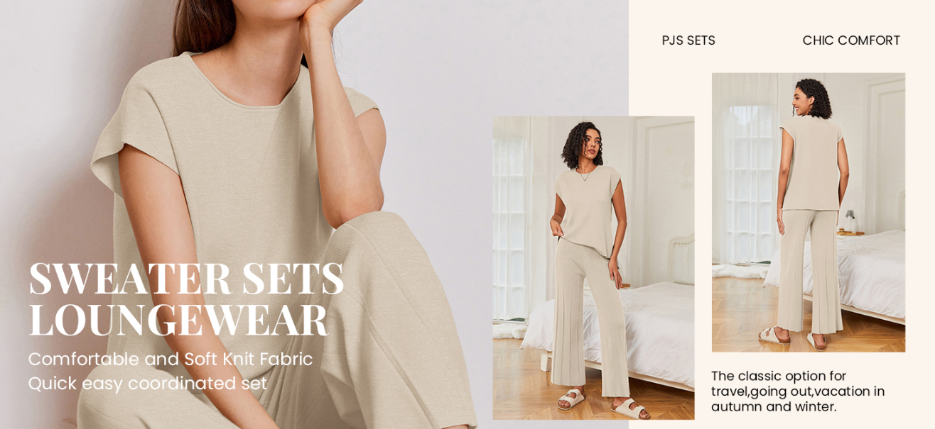 Comfortable Pants: Wide-leg knit pants with a high waist, elastic waistband, and pleated design.