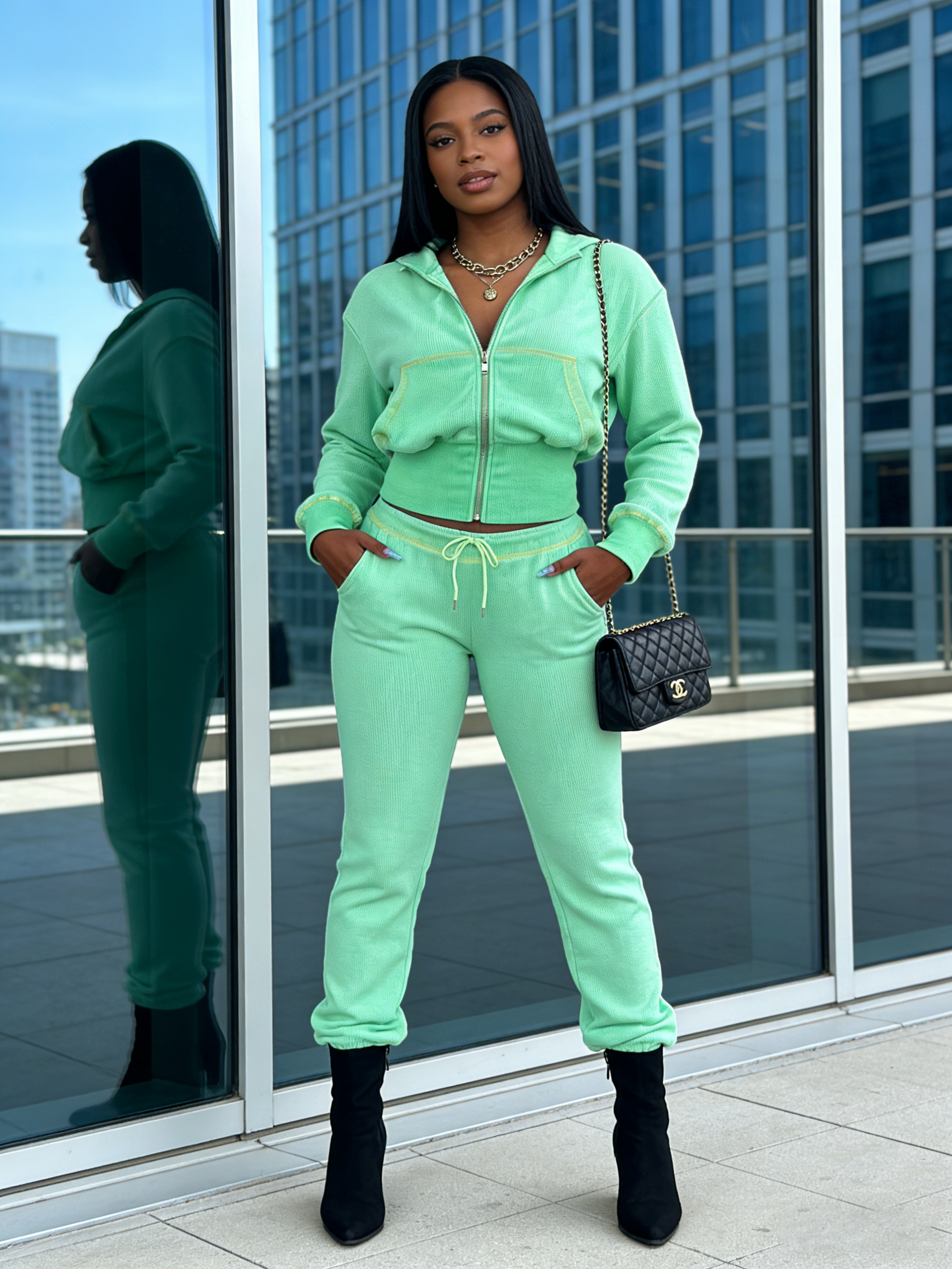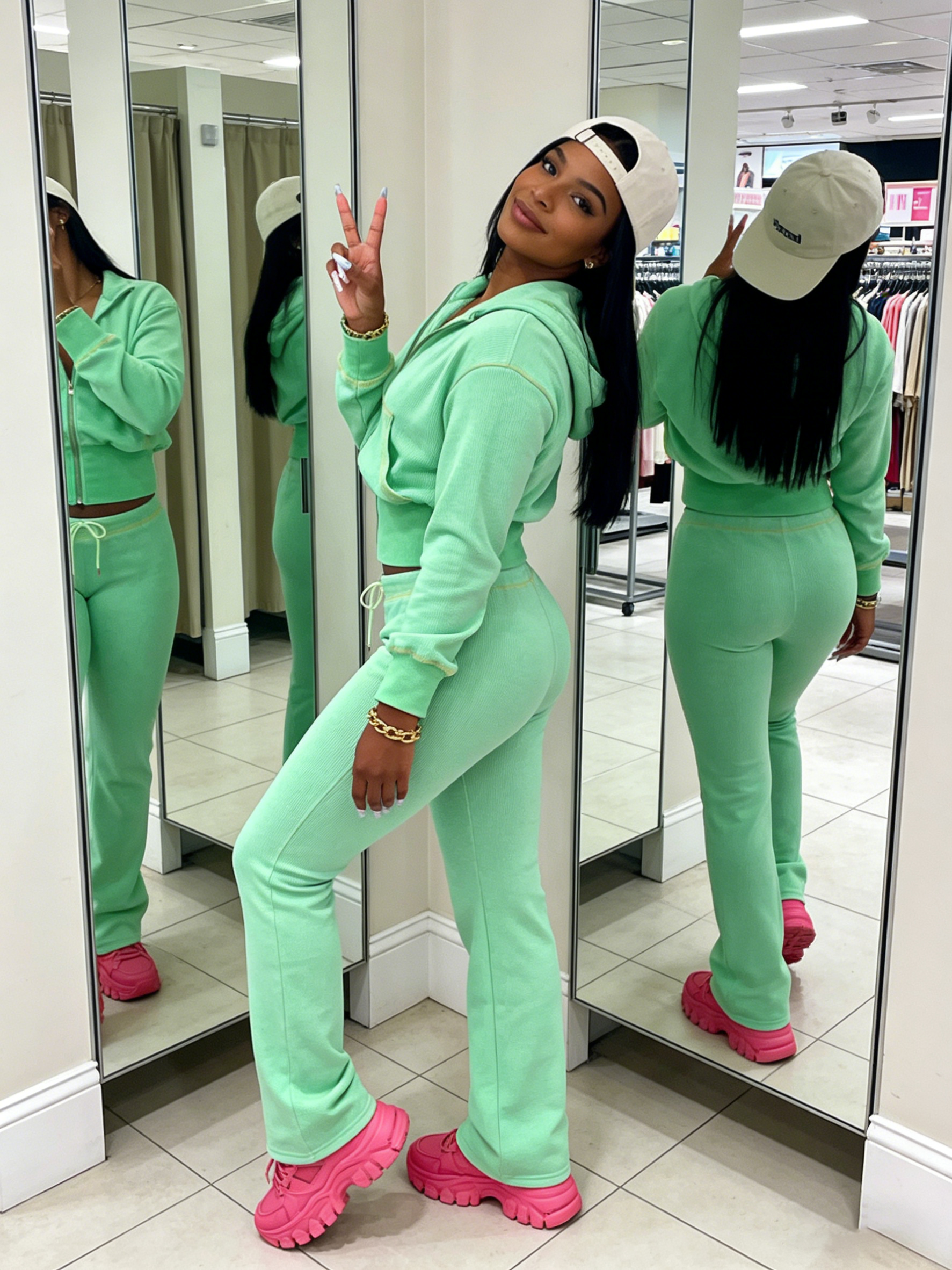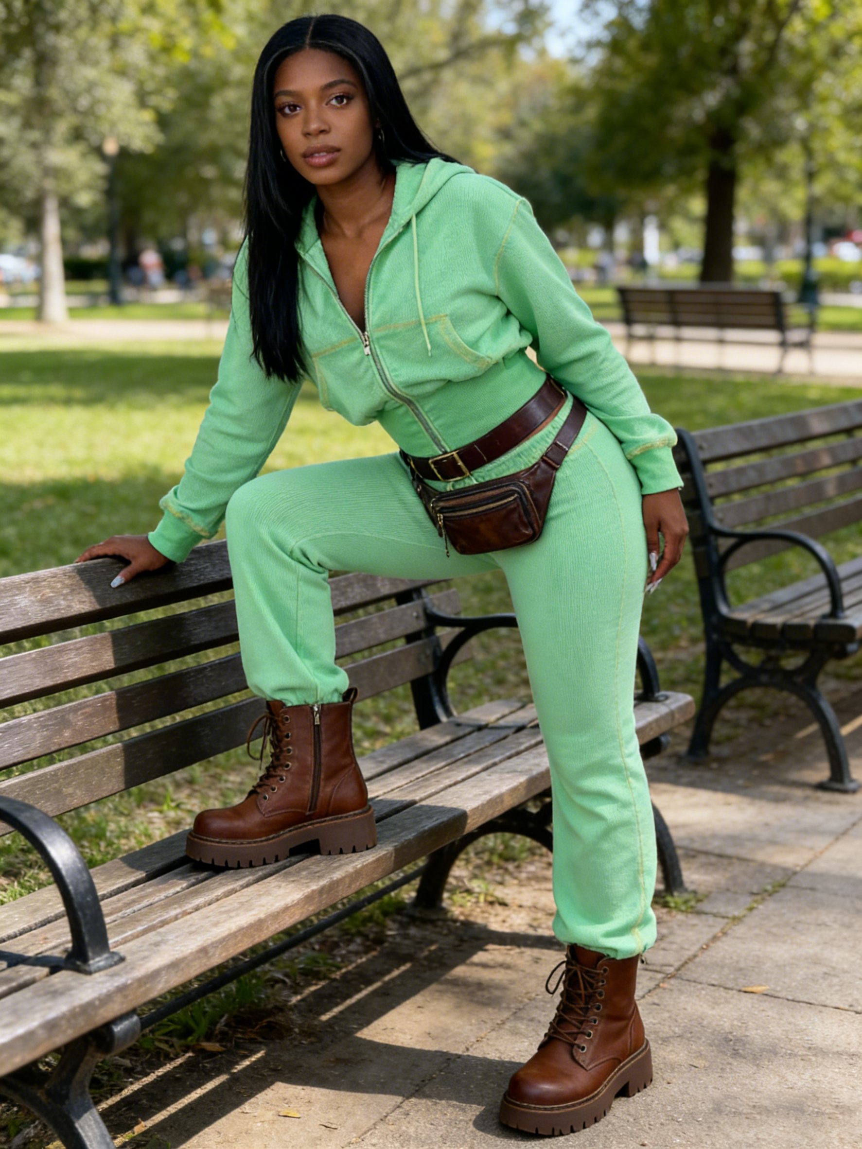 Product DetailsThis women's tracksuit set features a breathable, anti-static, and eco-friendly design made from knitted cotton and spandex fabric. The full-length, two-piece set includes a stand collar jacket and flared pants, styled with vintage pockets and zipper details. Suitable for all seasons, it offers comfort and versatility .